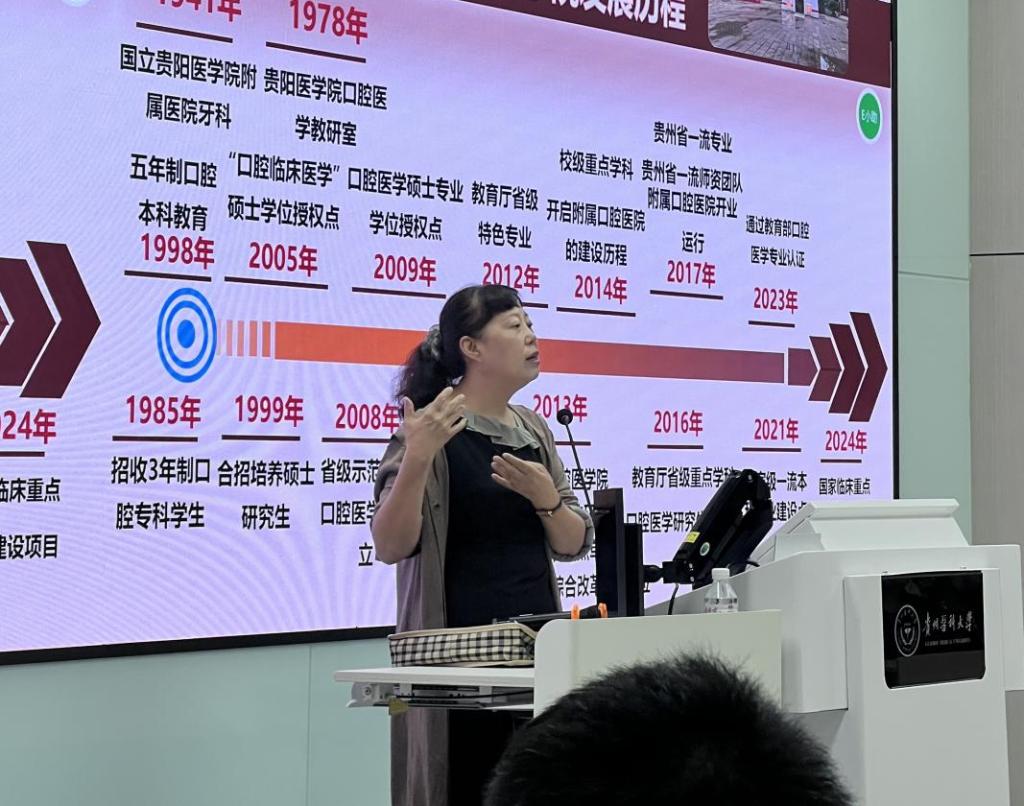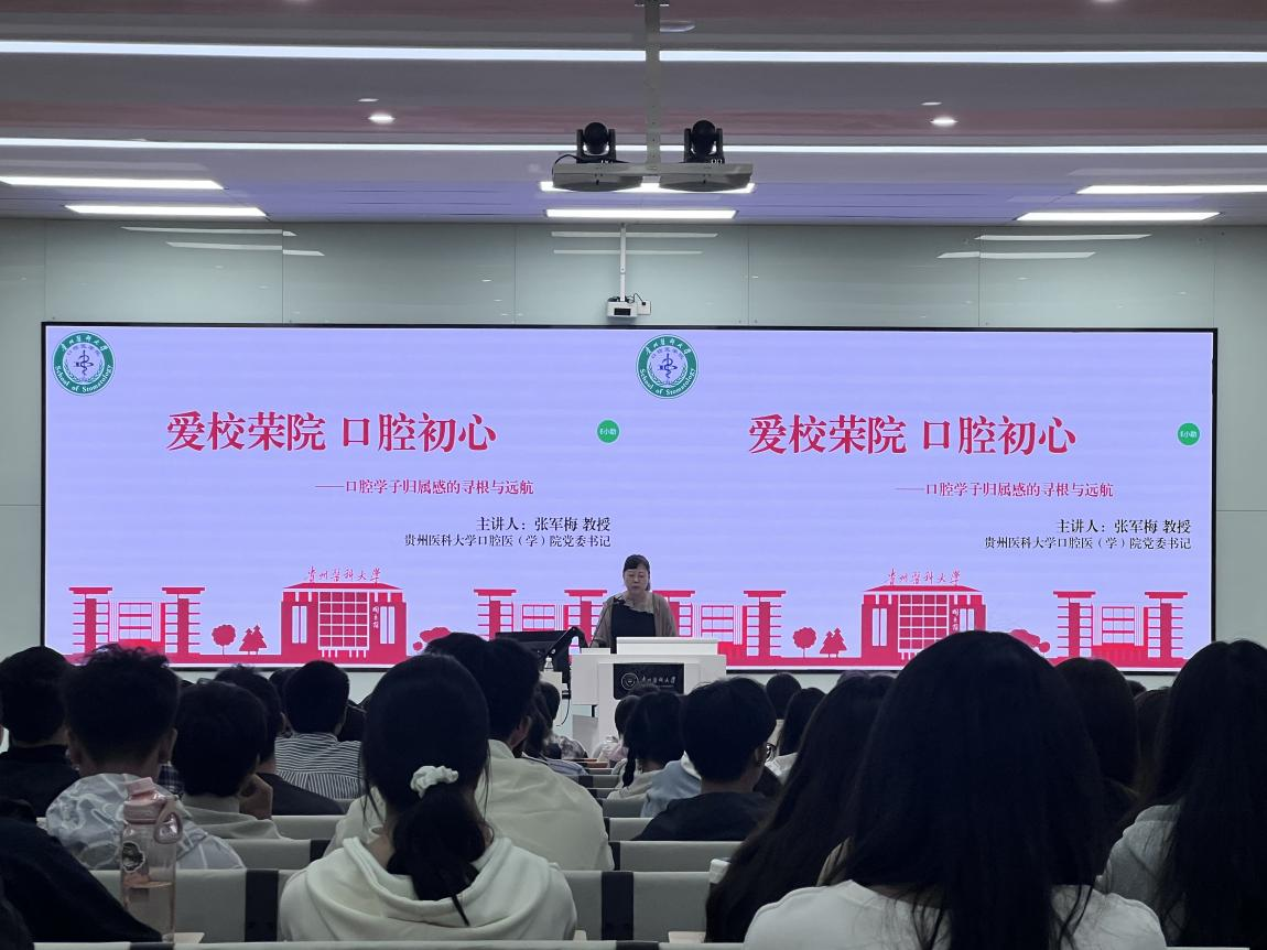 张军梅回顾了自1938年国立贵阳医学院创立及1941年口腔科成立以来,学院艰苦的发展历程。她指出,经过八十余载建设,学院已从简陋诊室发展为拥有数字化虚拟仿真实验室的现代化教学基地,凝聚了一代代口腔人的奋斗精神。她阐述了口腔医学的重要性,强调其是全身健康的“重要窗口”,深入解读了口腔初心“担当大健康使命、追求精益求精技艺、秉持人本温度”的三重内涵。同时,她指出归属感源于实践与服务,通过勤学善思、临床实训与学科竞赛,学生能深化对学员的认同感,并以我院学生荣获全国口腔技能大赛金奖为例,说明实践成就是凝聚归属感的重要途径。