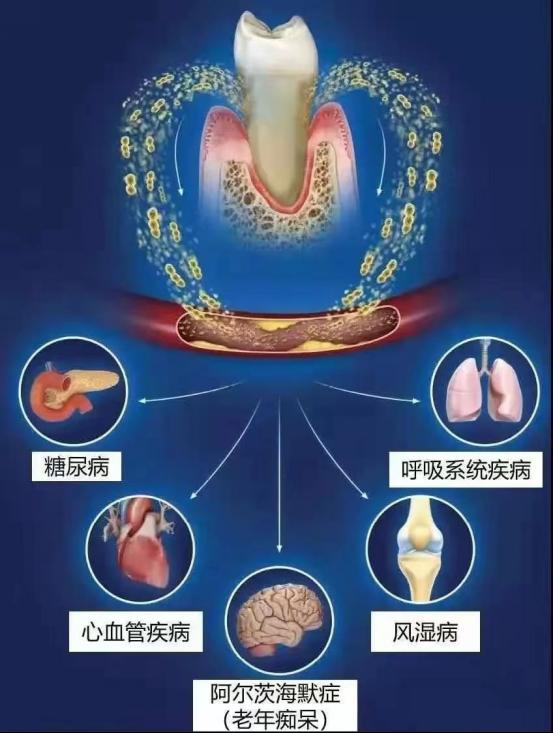 口腔是消化道和呼吸道的共同起始部位,口腔内的细菌极易侵犯呼吸及消化系统。流行病学研究显示,慢性阻塞性肺气肿、慢性支气管炎、慢性胃炎、胃溃疡等疾病均与慢性牙周炎密切相关。口腔微生物,尤其是牙周袋内的厌氧菌可能增加了消化、呼吸系统器官感染的风险。