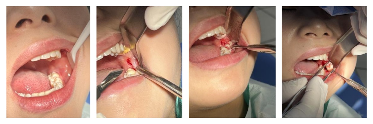 口腔检查- 拍片-局麻-检查麻醉效果- 切开牙龈 - 去除邻牙阻力、骨阻力和根阻力 - 取出牙冠及牙根- 拔牙创搔刮复位- 进行缝合—咬棉球止血 。